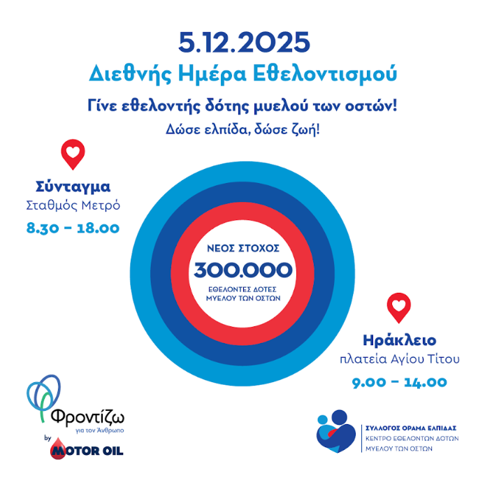 Πιο συγκεκριμένα, την ημέρα αυτή, από τις 10:00 έως τις 18:00, οι ομάδες εθελοντών του Συλλόγου μαζί με εθελοντές εργαζομένους του ομίλου Motor Oil θα υποδέχονται τους πολίτες που επιθυμούν να ενημερωθούν για τη σημασία της προσφοράς αιμοποιητικών κυττάρων στα ειδικά περίπτερα στο Μετρό στον σταθμό του Συντάγματος στην Αθήνα και στην Πλατεία Αγίου Τίτου στο Ηράκλειο.