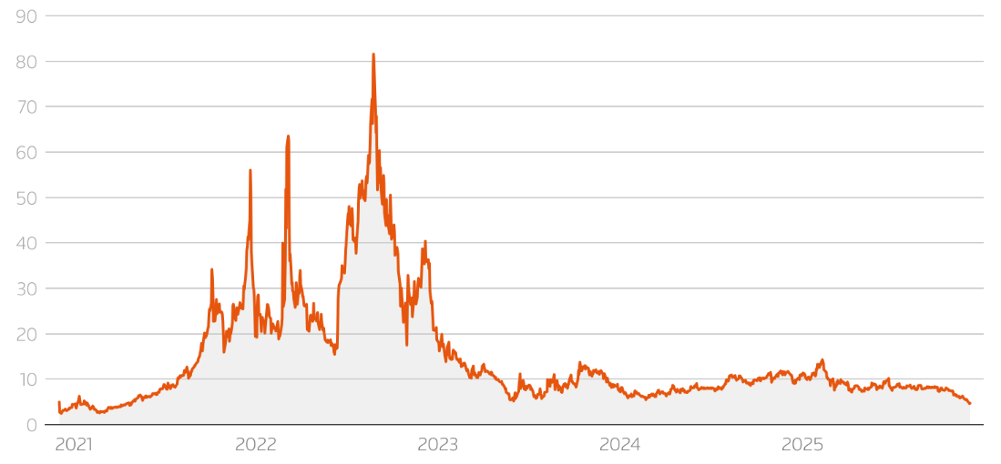 Η νέα αυτή εικόνα έχει γίνει ήδη ορατή. Αυτή την εβδομάδα, το αμερικανικό ορόσημο του φυσικού αερίου Henry Hub έφτασε στο υψηλότερο επίπεδο της τελευταίας τριετίας στα 5 δολάρια ανά mmbtu για τα συμβόλαια του Ιανουαρίου. Παράλληλα, το ευρωπαϊκό ορόσημο TTF κινείται στα χαμηλότερα επίπεδά του μετά το 2022, πέφτοντας κάτω από τα 30 ευρώ ανά MWh. Ως εκ τούτου, το σπρεντ μεταξύ των δύο τιμών έχει περιοριστεί στα 4,7 δολάρια mmbtu, χαμηλό τετραετίας, συρρικνώνοντας τα περιθώρια κέρδους των Αμερικανών εξαγωγέων.
