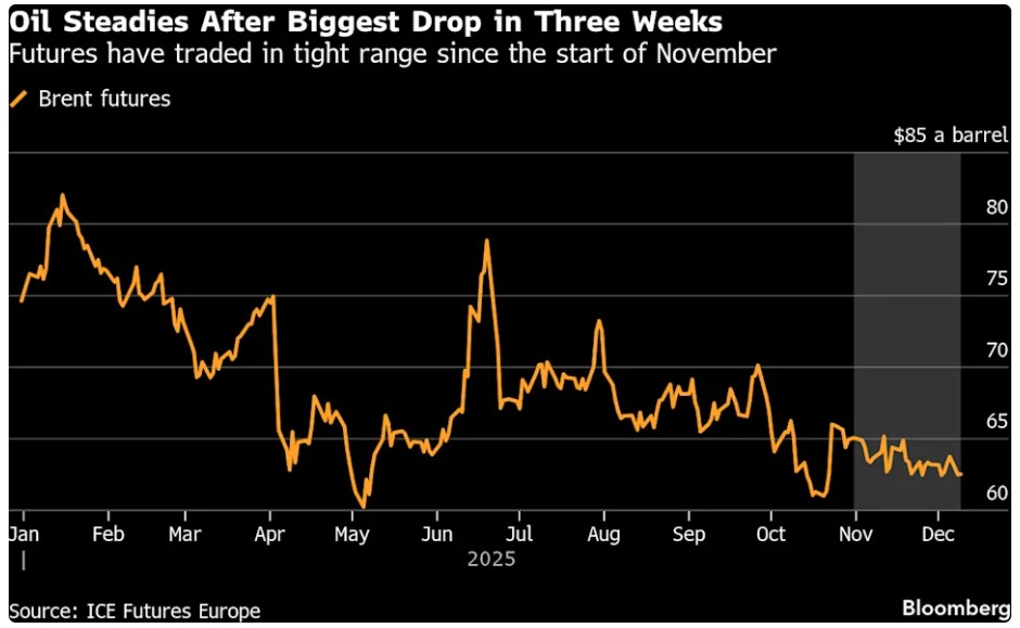 «Το πλεόνασμα στην αγορά πετρελαίου αναμένεται να αυξηθεί το 2026», με την προσφορά να υπερβαίνει τη ζήτηση κατά περισσότερα από 2 εκατομμύρια βαρέλια την ημέρα, δήλωσε ο Warren Patterson, επικεφαλής στρατηγικής εμπορευμάτων της ING Groep NV. «Προβλέπουμε ότι το Brent θα έχει μέση τιμή 57 δολάρια το βαρέλι κατά τη διάρκεια του έτους, με βασική υπόθεση ότι οι ροές ρωσικού πετρελαίου θα συνεχιστούν αμείωτες παρά τις κυρώσεις των ΗΠΑ».