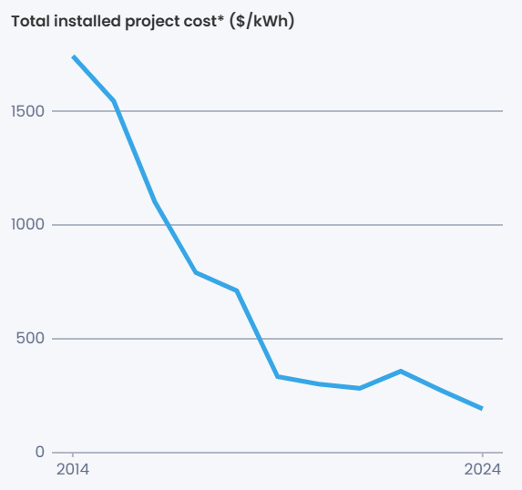 Το κόστος ανάπτυξης έργων αποθήκευσης έχει μειωθεί δραστικά. Πηγή: Ember.