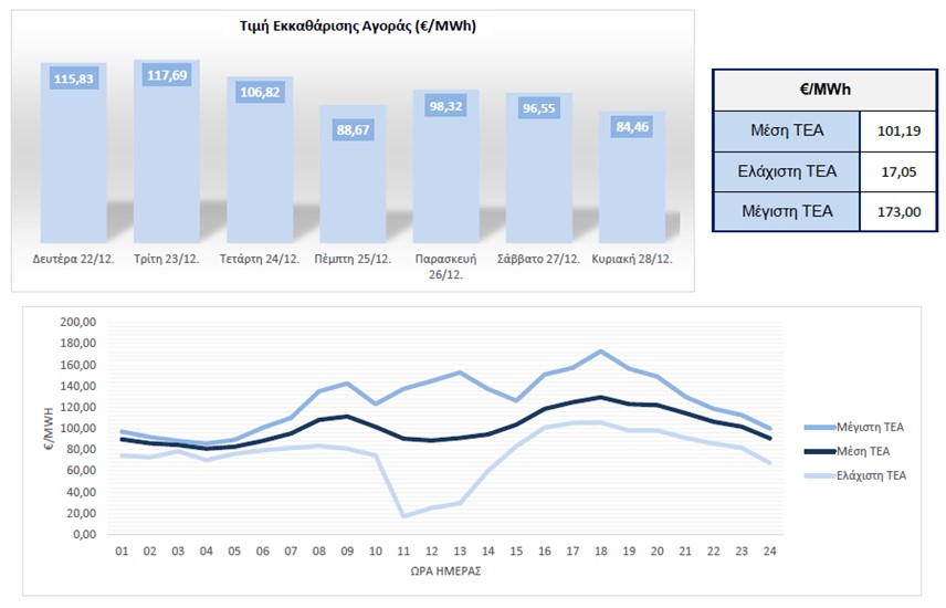 τη μέση ΤΕΑ της αμέσως προηγούμενης εβδομάδας, με τη μέγιστη και την ελάχιστη ΤΕΑ να διαμορφώνονται στα €173,00/MWh και στα €17,05/MWh αντιστοίχως. Αξίζει να αναφερθεί ότι η μεγαλύτερη μέση ΤΕΑ ανά ημέρα της προηγούμενης εβδομάδας επετεύχθη την περασμένη Τρίτη (23/12) φτάνοντας τα €117,69/MWh.