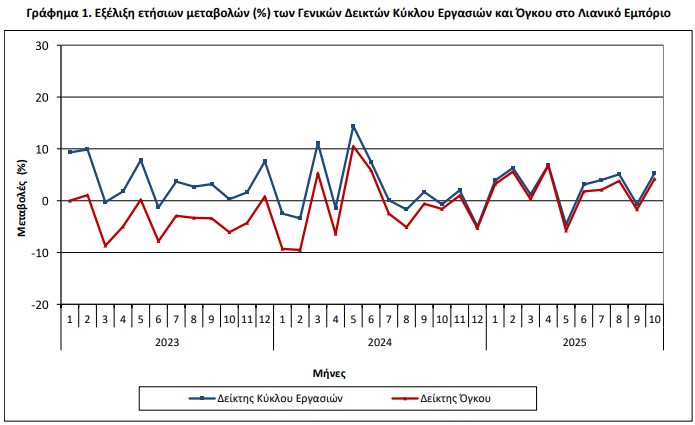 Ο Γενικός Δείκτης Όγκου (κύκλος εργασιών σε σταθερές τιμές), κατά τον μήνα Οκτώβριο 2025, σε σύγκριση με τον αντίστοιχο δείκτη του Οκτωβρίου 2024, παρουσίασε αύξηση 4,2% και σε σύγκριση με τον αντίστοιχο δείκτη του Σεπτεμβρίου 2025 αύξηση 1,7%.