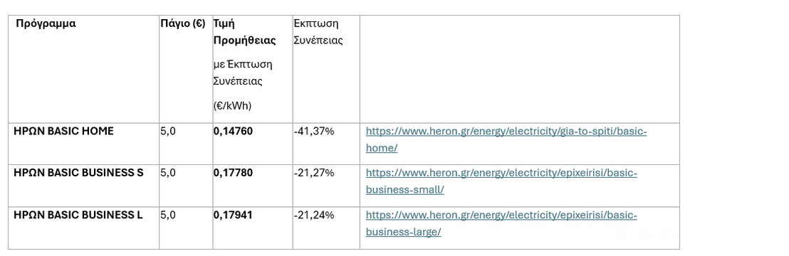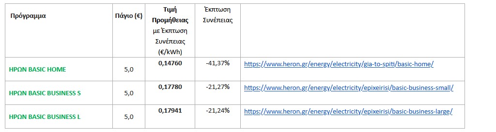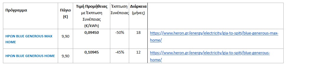 Υπενθυμίζεται, εξάλλου, ότι ο συγκεκριμένος πάροχος προσφέρει τις πολύ ανταγωνιστικές τιμές των σταθερών οικιακών προγραμμάτων HΡΩΝ ΒLUE GENEROUS, με το 18μηνο συμβόλαιο ΗΡΩΝ BLUE GENEROUS MAX να παραμένει κάτω από τα 9,5 λεπτά την κιλοβατώρα, εξασφαλίζοντας χαμηλή & σταθερή τιμή ως και την επόμενη άνοιξη.