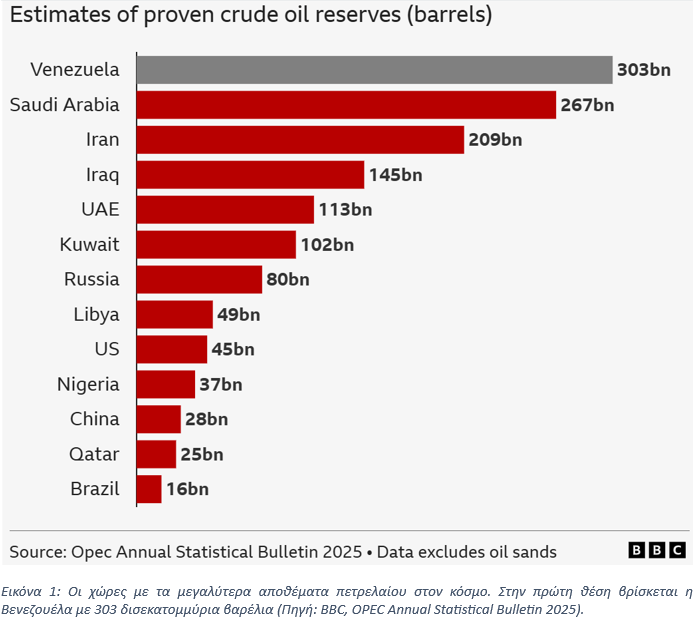 Η σημασία της Βενεζουέλας αποτυπώνεται πρωτίστως στο μέγεθος των αποθεμάτων της. Διαθέτει τα μεγαλύτερα αποδεδειγμένα αποθέματα υδρογονανθράκων παγκοσμίως, τα οποία εκτιμώνται σε περίπου 303 δισ. βαρέλια ισοδύναμου πετρελαίου, αντιπροσωπεύοντας το 17,5% των παγκόσμιων αποθεμάτων (Εικόνα 1).