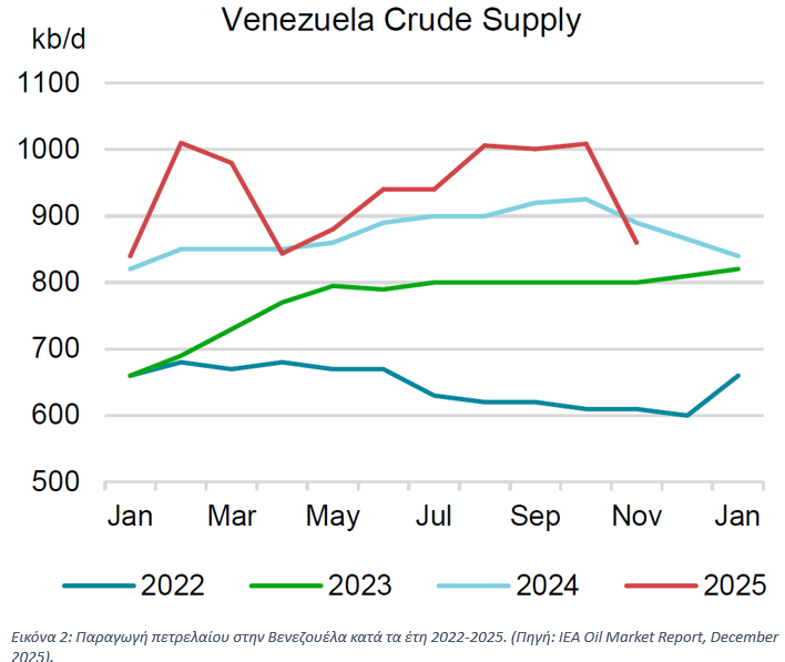 Παρά το εντυπωσιακό αυτό μέγεθος, η χώρα έχει οδηγηθεί σε δραματική κατάρρευση της παραγωγής. Η χρόνια κακοδιαχείριση του πετρελαϊκού τομέα από τις κυβερνήσεις των τελευταίων είκοσι ετών, οι πολιτικές παρεμβάσεις, η διαφθορά και οι κυρώσεις είχαν ως αποτέλεσμα τη μείωση της παραγωγής κατά περίπου 80% (Εικόνα 2). Στις αρχές της δεκαετίας του 2000 η Βενεζουέλα παρήγαγε περί τα 4,0 εκατ. βαρέλια ημερησίως, ενώ σήμερα η παραγωγή έχει περιοριστεί σε περίπου 860 χιλιάδες βαρέλια την ημέρα, με εξαγωγές της τάξης των 670 χιλιάδων βαρελιών (στοιχεία ΙΕΑ, Νοέμβριος 2025). Το σημερινό επίπεδο αντιστοιχεί σε λίγο λιγότερο από το 1% της παγκόσμιας παραγωγής.