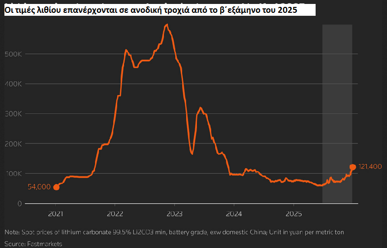 Ωστόσο, η δέσμευση του Πεκίνου τον Ιούλιο να περιορίσει την πλεονάζουσα παραγωγική ικανότητα σε διάφορους τομείς, συμπεριλαμβανομένου του λιθίου, και η διακοπή της παραγωγής τον Αύγουστο στο ορυχείο Jianxiawo, ιδιοκτησίας του κινεζικού γίγαντα μπαταριών CATL, που αντιπροσωπεύει περίπου το 3% της παγκόσμιας προσφοράς, πυροδότησαν μια παγκόσμια αύξηση των τιμών. Έτσι, οι τιμές του ανθρακικού λιθίου στο Χρηματιστήριο Μελλοντικής Εκπλήρωσης της Guangzhou αυξήθηκαν κατά 130% σε σχέση με το χαμηλότερο επίπεδο του 2025, αγγίζοντας το υψηλότερο επίπεδο από τον Νοέμβριο του 2023, φτάνοντας στα 134.500 γιουάν ανά τόνο στις 29 Δεκεμβρίου. Οι τιμές spot, όπως αξιολογήθηκαν από τον πάροχο πληροφοριών Fastmarkets, αυξήθηκαν κατά 108% κατά την ίδια περίοδο.