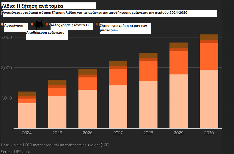Η ζήτηση λιθίου για αποθήκευση ενέργειας αναμένεται να αυξηθεί κατά 55% το 2026, μετά από μια αύξηση ύψους 71% το 2025, σύμφωνα με υπολογισμό του Reuters που βασίζεται σε στοιχεία της UBS. Ο χρηματιστής Guotai Junan προέβλεψε ότι η ζήτηση ισοδύναμου ανθρακικού λιθίου για τις ανάγκες της αποθήκευσης ενέργειας θα αντιπροσωπεύει το 31% της συνολικής κατανάλωσης το 2026, από 23% το 2025, μειώνοντας το μερίδιο αγοράς που κυριαρχείται από τις μπαταρίες ηλεκτρικών οχημάτων.