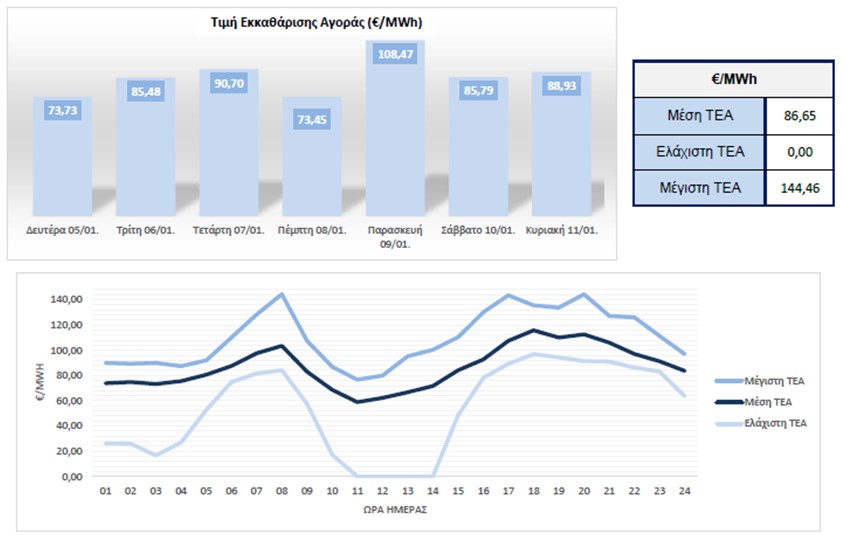 2026 ανήλθε στα €86,65/MWh, δηλαδή μειωμένη σε ποσοστιαία βάση κατά7,07%από τη μέση ΤΕΑ της αμέσως προηγούμενης εβδομάδας, με τη μέγιστη και την ελάχιστη ΤΕΑ να διαμορφώνονται στα €144,46/MWh και στα €0,00/MWh αντιστοίχως. Αξίζει να αναφερθεί ότι η μεγαλύτερη μέση ΤΕΑ ανά ημέρα της προηγούμενης εβδομάδας επετεύχθη την περασμένη Παρασκευή (9/1) φτάνοντας τα €108,47/MWh.