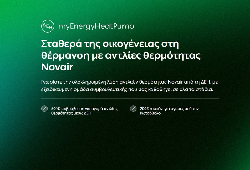 Το ΔΕΗ myEnergy HeatPump παρέχει μία ολοκληρωμένη λύση για την πλήρη αναβάθμιση του συστήματος θέρμανσης και ψύξης, με μελέτη, εγκατάσταση και τεχνική υποστήριξη από εξειδικευμένους συνεργάτες της ΔΕΗ, διασφαλίζοντας διαφάνεια και αξιοπιστία σε κάθε στάδιο της διαδικασίας, από την αρχική προσφορά έως και μετά την ολοκλήρωση της εγκατάστασης του συστήματος. Οι αντλίες θερμότητας Novair εξασφαλίζουν εξοικονόμηση ενέργειας έως και 70% σε σχέση με τα συμβατικά συστήματα, μειώνουν τις εκπομπές CO₂ και προσφέρουν υψηλή ενεργειακή κλάση (A+++), με δυνατότητα απομακρυσμένου ελέγχου, αποκλειστικά μέσα από τον ψηφιακό σύμβουλο ΔΕΗ myEnergy Coach. Έτσι, η διαχείριση της ενέργειας γίνεται εύκολη και πλήρως προσαρμοσμένη στον τρόπο ζωής κάθε νοικοκυριού.