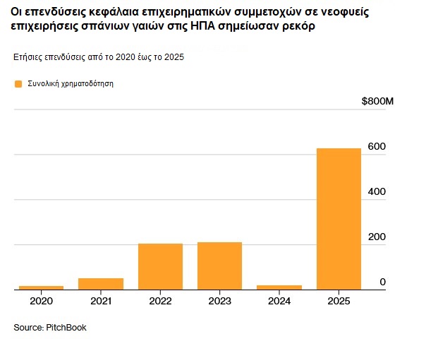 Οι επενδυτές σε κεφάλαια επιχειρηματικών συμμετοχών (Venture capital) επένδυσαν περισσότερα από 628 εκατομμύρια δολάρια σε αμερικανικές startups που δραστηριοποιούνται σε ορυκτές σπάνιες γαίες το 2025, σύμφωνα με στοιχεία του PitchBook, ποσό που ισοδυναμεί με το 90% της συνολικής χρηματοδότησης παγκοσμίως. Η εξέλιξη αυτή ισοδυναμεί με εκτίναξη των επενδύσεων κατά περίπου 3.000% σε σύγκριση με το 2024 και χωρίς να συνυπολογιστούν οι κυβερνητικές συμφωνίες, συμπεριλαμβανομένης της επένδυσης μετοχικού κεφαλαίου 400 εκατομμυρίων δολαρίων του Υπουργείου Άμυνας των ΗΠΑ τον Ιούλιο στην MP Materials Corp., εισηγμένη εταιρεία σπάνιων γαιών.