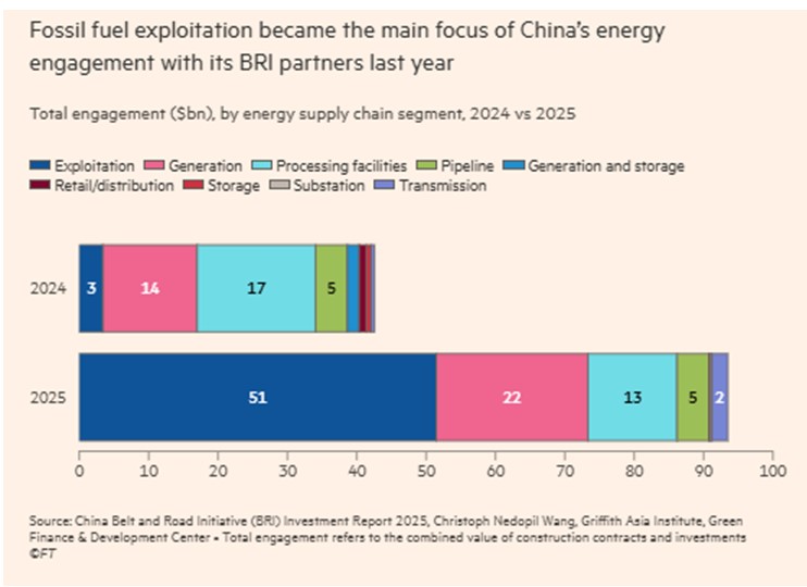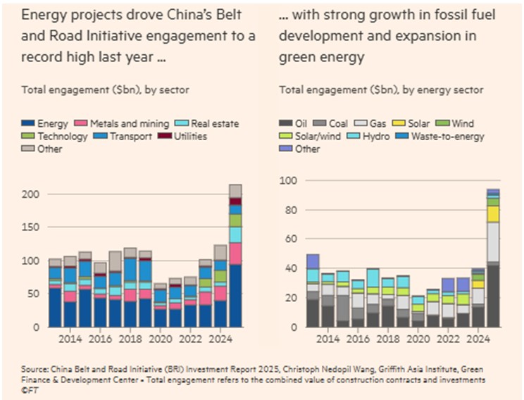 Η αύξηση των νέων επενδύσεων και των συμφωνιών κατασκευής κυριαρχήθηκε από τα μεγάλα έργα φυσικού αερίου και την πράσινη ενέργεια, σύμφωνα με έρευνα του Πανεπιστημίου Griffith της Αυστραλίας και του Κέντρου Πράσινης Χρηματοδότησης και Ανάπτυξης στη Σαγκάη, αναφέρουν οι FT. Το Πεκίνο υπέγραψε 350 συμφωνίες πέρυσι, από 293 αξίας 122,6 δισεκατομμυρίων δολαρίων το 2024.