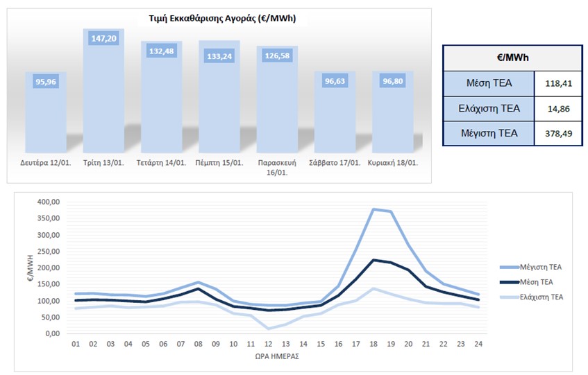 εβδομάδας, με τη μέγιστη και την ελάχιστη ΤΕΑ να διαμορφώνονται στα €378,49/MWh και στα €14,86/MWh αντιστοίχως. Αξίζει να αναφερθεί ότι η μεγαλύτερη μέση ΤΕΑ ανά ημέρα της προηγούμενης εβδομάδας επετεύχθη την περασμένη Τρίτη (13/1) φτάνοντας τα €147,20/MWh.