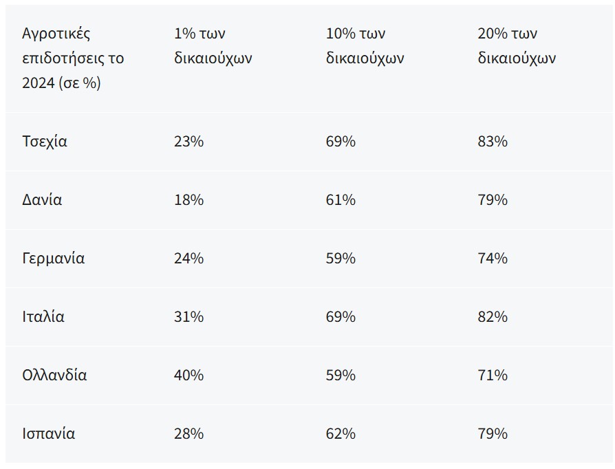 Η Ολλανδία παρουσιάζει την πιο ακραία συγκέντρωση μεταξύ των χωρών που αναλύθηκαν, με μόλις το 1% των δικαιούχων να λαμβάνει το 40% των επιδοτήσεων της ΚΑΠ. Στο σύνολο των έξι χωρών, το 10% των παραληπτών λαμβάνει κατά μέσο όρο τα δύο τρίτα των επιδοτήσεων, ενώ το 20% λαμβάνει περίπου τα τέσσερα πέμπτα[2].