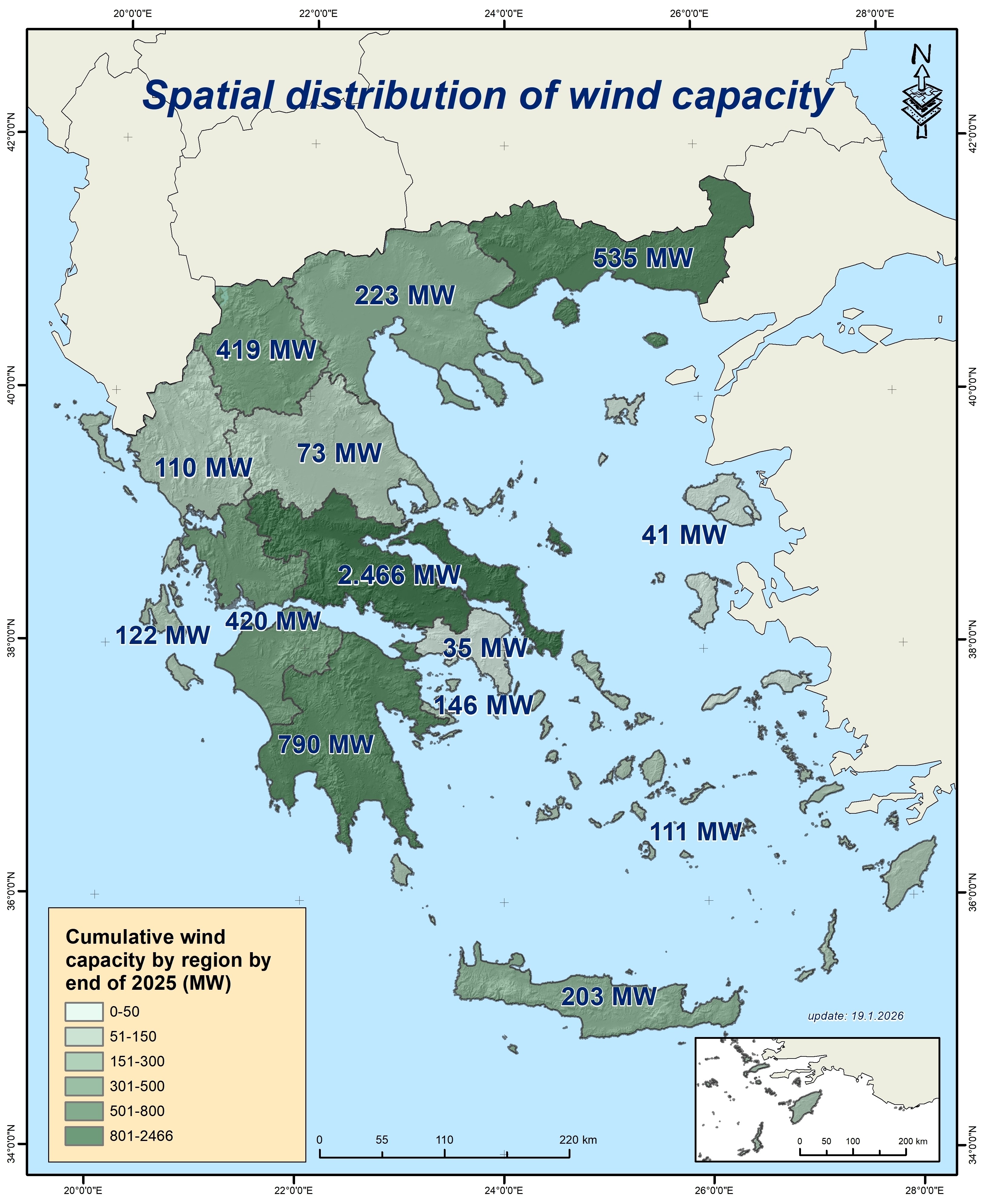 Σε επίπεδο Περιφερειών, η Στερεά Ελλάδα παραμένει στην κορυφή των αιολικών εγκαταστάσεων αφού φιλοξενεί 2.466 MW (43,3%) και ακολουθεί η Πελοπόννησος με 790 ΜW (13,9%) και η Ανατολική Μακεδονία-Θράκη όπου βρίσκονται 535 MW (9,4%).