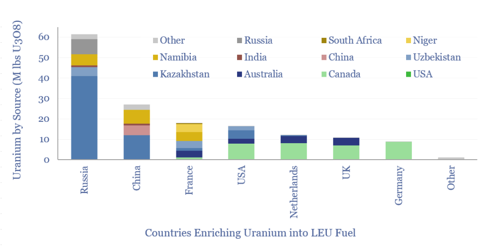 Η δυναμικότητα παραγωγής εμπλουτισμένου ουρανίου ανά χώρα. Πηγή: Thunder Said Energy.