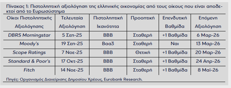 Ειδικότερα, όπως αναφέρει η Eurobank στο δελτίο «7 Ημέρες Οικονομία» που εκδόθηκε στις 23 Ιανουαρίου 2026, ανάμεσα στους πέντε οίκους πιστοληπτικής αξιολόγησης που λαμβάνει υπόψιν της η Ευρωπαϊκή Κεντρική Τράπεζα στο πλαίσιο της άσκησης νομισματικής πολιτικής (καταλληλότητα ενεχύρων για την παροχή ρευστότητας), ο οίκος DBRS Morningstar θα εγκαινιάσει τον πρώτο γύρο αξιολογήσεων της ελληνικής οικονομίας για το έτος 2026, στις 6 Μαρτίου 2026. Σημειώνεται ότι την ίδια μέρα είναι προγραμματισμένο να ανακοινωθούν από την Ελληνική Στατιστική Αρχή (ΕΛΣΤΑΤ) οι εθνικοί λογαριασμοί του 2025 και του δ’ τριμήνου 2025, καθώς και η τριμηνιαία έρευνα εργατικού δυναμικού του δ’ τριμήνου 2025.