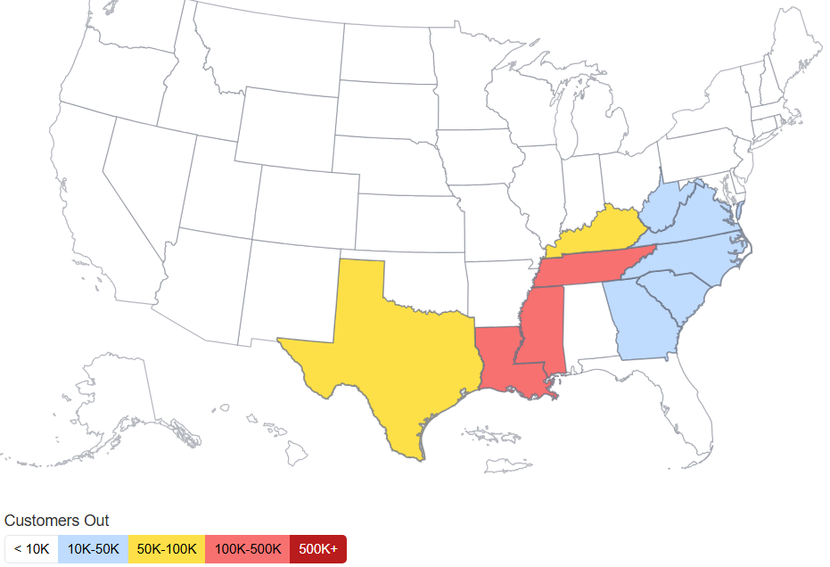 (Χάρτης περιοχών των ΗΠΑ που πλήττονται από διακοπές στην ηλεκτροδότηση (σε χιλιάδες νοικοκυριά). Πηγή:poweroutage.us.)