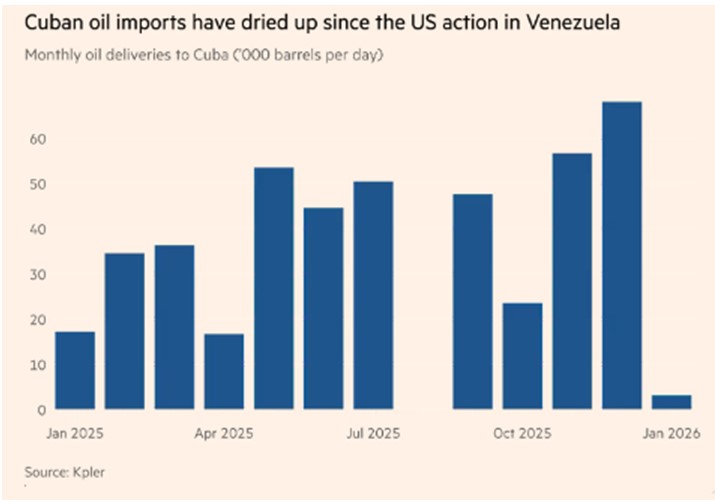 Στις 11 Ιανουαρίου, δύο ημέρες μετά την τελευταία παράδοση από το Μεξικό και μια εβδομάδα μετά τη σύλληψη του ηγέτη της Βενεζουέλας Nicolás Maduro από τις ΗΠΑ, ο Trump δεσμεύτηκε ότι «δεν θα πηγαίνει άλλο πετρέλαιο» στην Αβάνα.