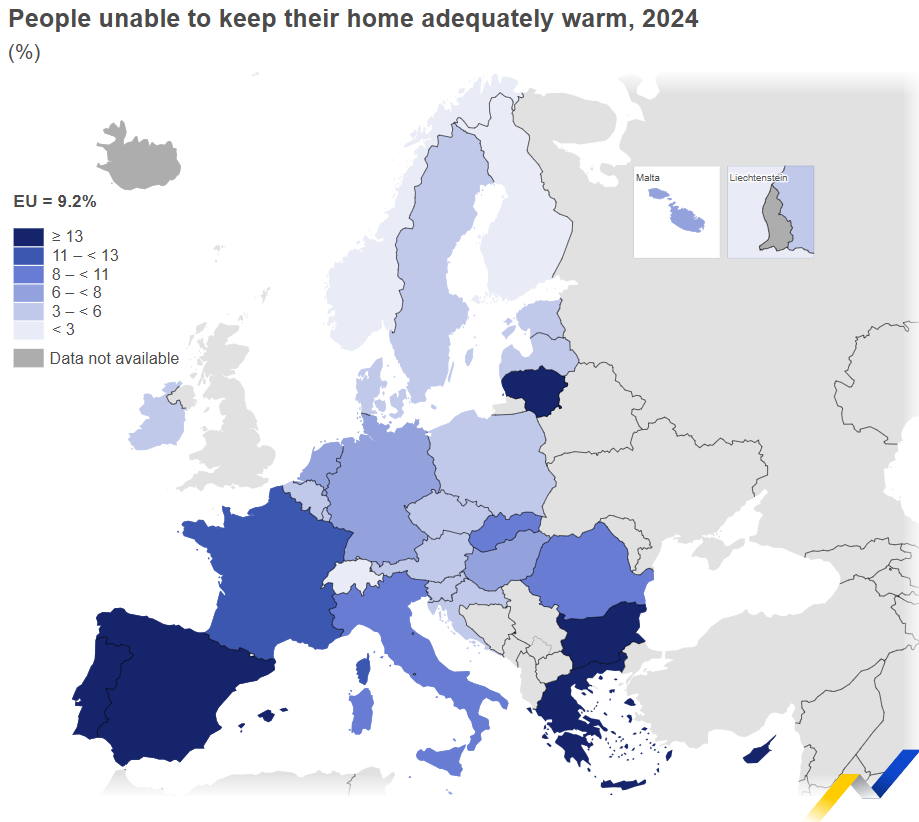Το υψηλότερο ποσοστό πληθυσμού που αδυνατεί να διατηρήσει το σπίτι του επαρκώς ζεστό καταγράφεται στην Ελλάδα και τη Βουλγαρία (και οι δύο 19%) και ακολουθούν η Λιθουανία (18%) και η Ισπανία (17,5%).