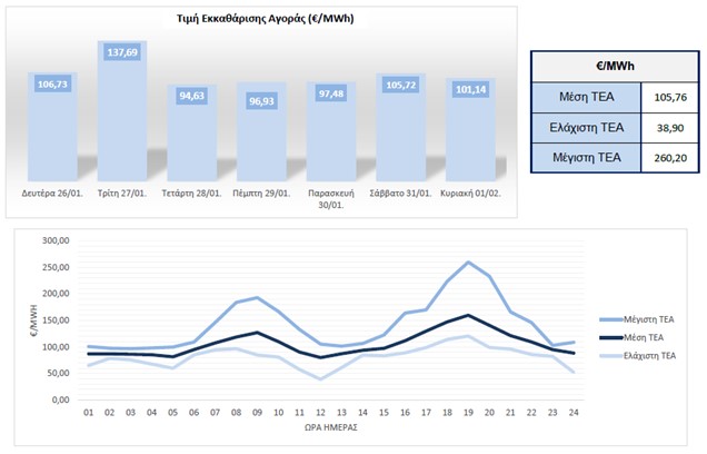 προηγούμενης εβδομάδας, με τη μέγιστη και την ελάχιστη ΤΕΑ να διαμορφώνονται στα €260,20/MWh και στα €38,90/MWh αντιστοίχως. Αξίζει να αναφερθεί ότι η μεγαλύτερη μέση ΤΕΑ ανά ημέρα της προηγούμενης εβδομάδας επετεύχθη την περασμένη Τρίτη (27/1) φτάνοντας τα €137,69/MWh.