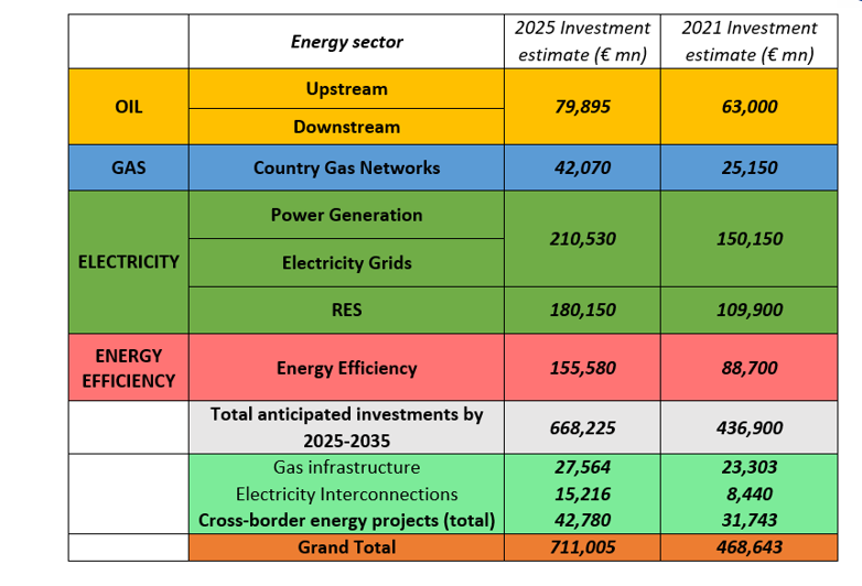 Αναλυτικότερα, η μελέτη αναφοράς του ΙΕΝΕ προβλέπει ως το 2035 επενδύσεις ύψους 210,53 δις ευρώ σε ηλεκτροπαραγωγή και δίκτυα, 180,15 δις ευρώ σε ΑΠΕ, 155,58 δις ευρώ (έναντι μόλις 88, 7 δις ευρώ στην έκδοση του 2021/22), στον τομέα του πετρελαίου (παραγωγή και διύλιση) σα 79,895 δις ευρώ, 42,07 δις ευρώ στα εσωτερικά δίκτυα των χωρών της περιοχής, ενώ σε διασυνδετήριους αγωγούς φυσικού αερίου και συναφείς υποδομές προβλέπει επενδύσεις ύψους περίπου 27, 6 δις ευρώ και σε διασυνοριακές ηλεκτρικές διασυνδέσεις 15,2 δις ευρώ (βλ. Πίνακα 1).