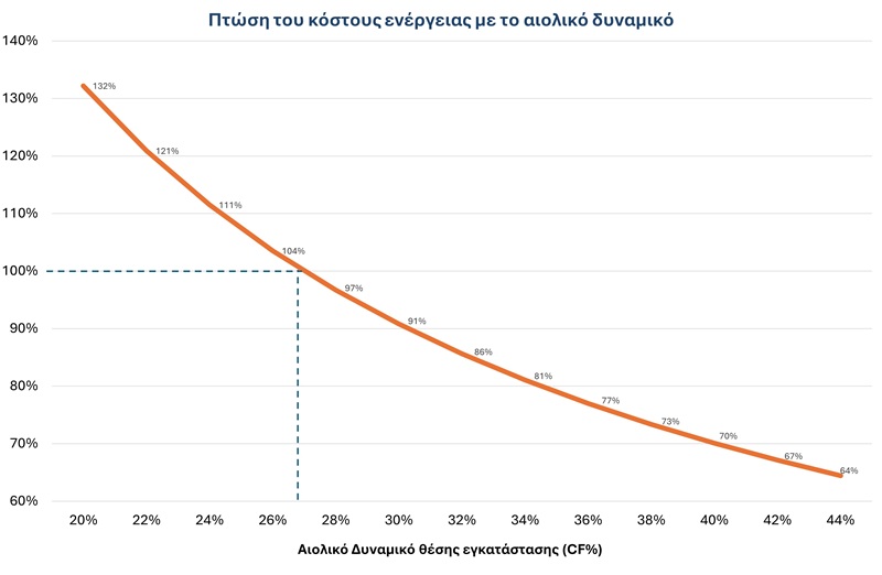 Διάγραμμα: Πώς μειώνεται το κόστος ενέργειας όσο αυξάνεται το αιολικό δυναμικό