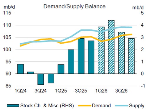 Σύμφωνα με στοιχεία του ΙΕΑ, η παραγωγή αργού της Βενεζουέλας μειώθηκε κατά 210 χιλ. βαρέλια ημερησίως σε μηνιαία βάση, στα 780 χιλ. βαρέλια ημερησίως τον Ιανουάριο, ωστόσο αναμένεται να ανακάμψει μετά την έγκριση από την Ουάσιγκτον μιας διαδικασίας που επιτρέπει σε εταιρείες με έδρα τις ΗΠΑ – συμπεριλαμβανομένων αμερικανικών θυγατρικών διεθνών ομίλων – να εξάγουν πετρέλαιο Βενεζουέλας. Συνολικά, η παγκόσμια προσφορά πετρελαίου αναμένεται να αυξηθεί κατά 2.4 εκατ. βαρέλια ημερησίως το 2026, με την αύξηση να κατανέμεται ισομερώς μεταξύ χωρών εκτός OPEC+ και χωρών του OPEC+, υπό την προϋπόθεση ότι το μπλοκ θα διατηρήσει την τρέχουσα συμφωνία παραγωγής.