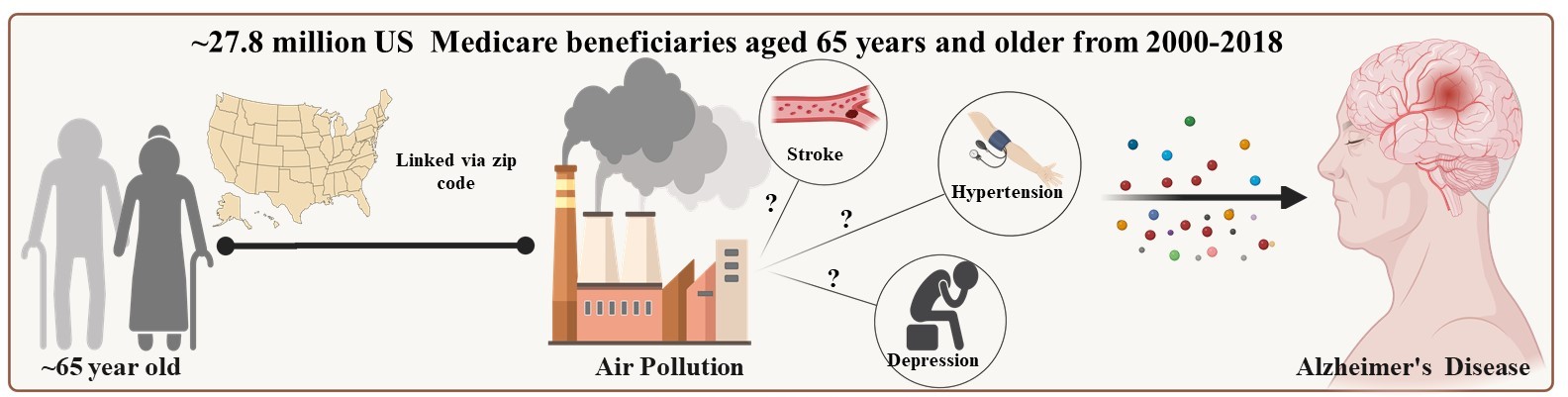 Διαπίστωσαν ότι η μεγαλύτερη έκθεση στην ατμοσφαιρική ρύπανση συσχετίστηκε με αυξημένο κίνδυνο εμφάνισης Αλτσχάιμερ, ενώ η συσχέτιση αυτή ήταν ελαφρώς ισχυρότερη σε άτομα που είχαν υποστεί εγκεφαλικό επεισόδιο. Αντίθετα, η υπέρταση και η κατάθλιψη φάνηκε να έχουν μικρή επιπρόσθετη επίδραση.