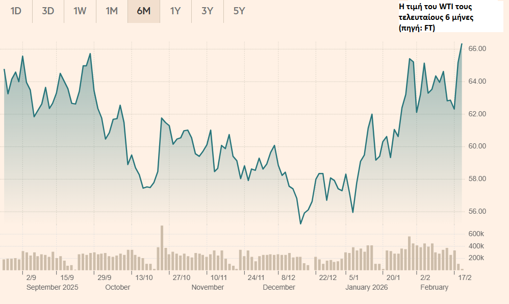 Γύρω στις 15.45 (ώρα Ελλάδας) η τιμή του βαρελιού του αμερικανικού πετρελαίου WTI κυμαινόταν στα 66,62 δολάρια, με αύξηση +2,19%. Νωρίτερα, είχε φτάσει και τα 66,71 δολάρια, την υψηλότερη τιμή από τον περασμένο Αύγουστο. Το πετρέλαιο Brent της Βόρειας Θάλασσας έφτασε τα 71,76 δολάρια το βαρέλι, με αύξηση 2%.