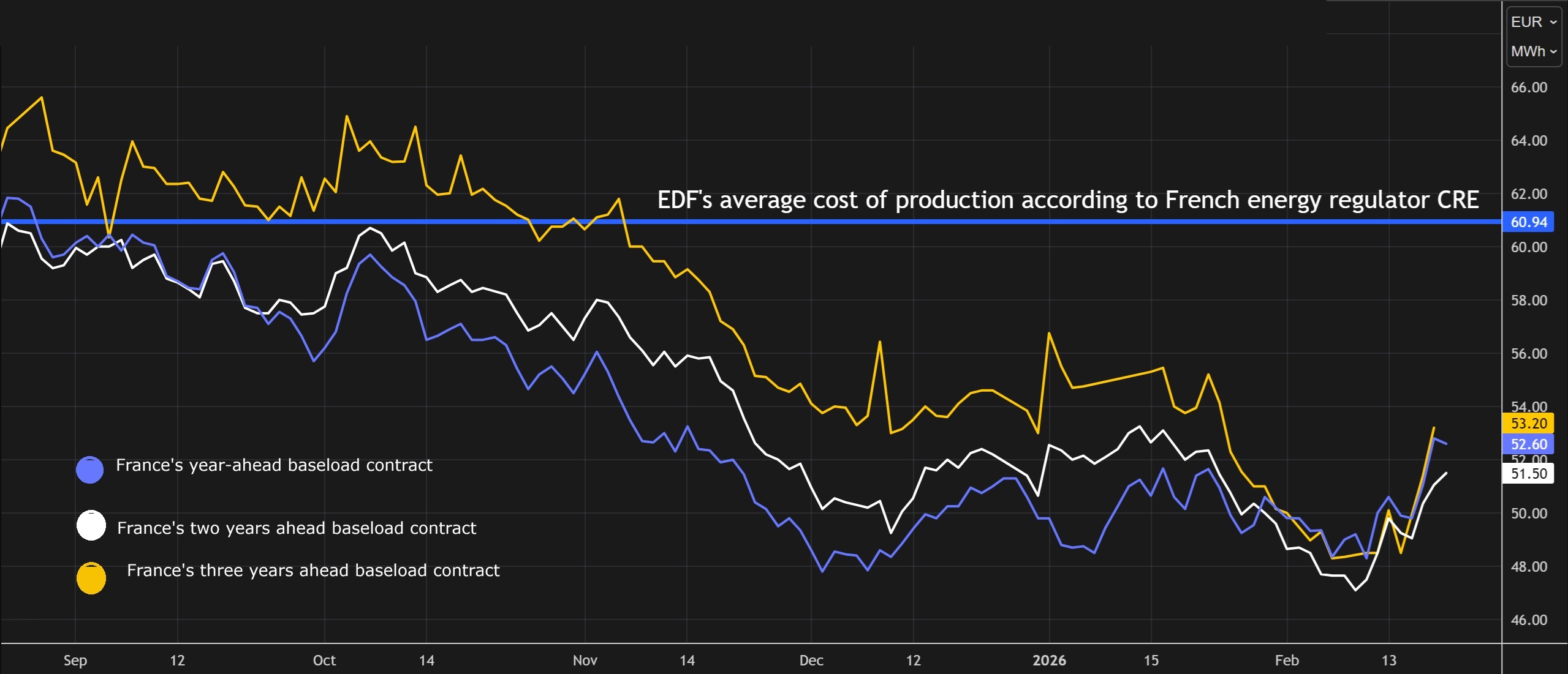 Ετήσια μείωση 19% κατέγραψαν τα βασικά κέρδη της EDF για το 2025, πέφτοντας στα 29,3 δισεκατομμύρια ευρώ. Μάλιστα, η συρρίκνωση των κερδών αναμένεται να συνεχιστεί και το 2026, σύμφωνα με τη διοίκηση του ομίλου, καθώς η κεντρική αιτία δεν πρόκειται να αλλάξει. Αυτή είναι ο συνδυασμός των χαμηλών τιμών χονδρεμπορικής ηλεκτρικής ενέργειας χάρη στην υπερ-παραγωγή των ΑΠΕ και της χαμηλής ζήτησης. Χαρακτηριστικά, η τιμή του ετήσιου συμβολαίου είχε καταρρεύσει στα 50 ευρώ ανά MWh τον Οκτώβριο, πολύ πιο κάτω από τις τιμές που η EDF χρειάζεται για να αντισταθμίσει το κόστος της. Ταυτόχρονα, η ζήτηση από τους ενεργοβόρους τομείς της αγοράς, όπως η βιομηχανία, παραμένει στάσιμη.