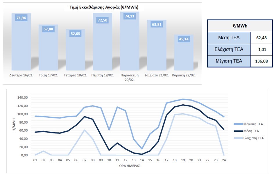 ΤΕΑ της αμέσωςπροηγούμενης εβδομάδας, με τη μέγιστη και την ελάχιστη ΤΕΑ να διαμορφώνονται στα €136,08/MWh και στα -€1,01/MWh αντιστοίχως. Αξίζει να αναφερθεί ότι η μεγαλύτερη μέση ΤΕΑ ανά ημέρα της προηγούμενης εβδομάδας επετεύχθη την περασμένη Παρασκευή (20/2) φτάνοντας τα €74,11/MWh.