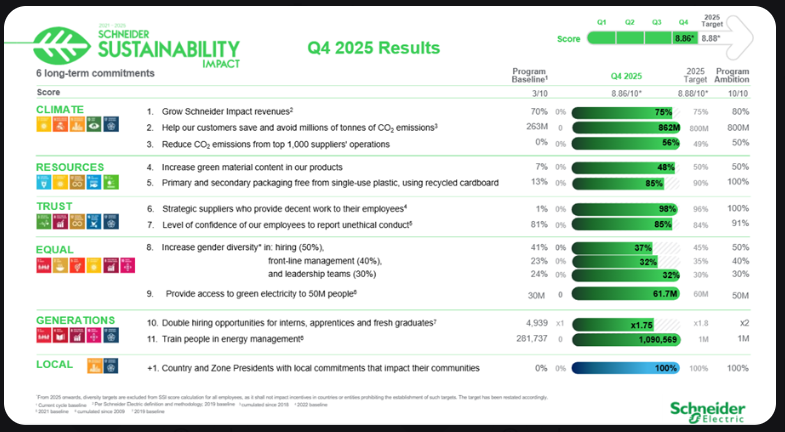 Για μια λεπτομερή εικόνα όλων των δεικτών και της προόδου, ανατρέξτε στην πλήρη έκθεση Schneider Sustainability Impact για το 4ο τρίμηνο του 2025, συμπεριλαμβανομένου του τελευταίου πίνακα ελέγχου προόδου: