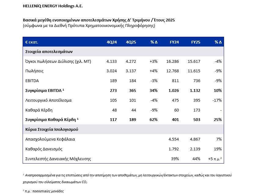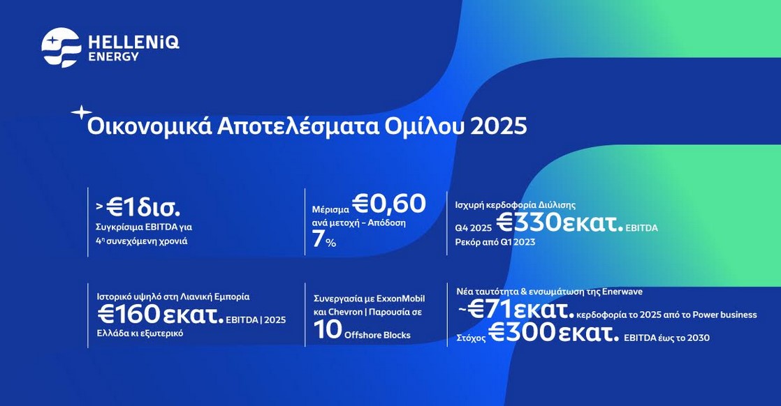 Η HELLENiQ ENERGY Holdings Α.Ε. («Εταιρεία») ανακοίνωσε τα ενοποιημένα οικονομικά αποτελέσματα για το 2025, με τα Συγκρίσιμα Κέρδη EBITDA να διαμορφώνονται στα €1.132 εκατ. και τα Συγκρίσιμα Καθαρά Κέρδη στα €503 εκατ. Τα αποτελέσματα του στρατηγικού μετασχηματισμού, η βελτίωση του διεθνούς περιβάλλοντος διύλισης, σε συνδυασμό με την ισχυρή λειτουργική απόδοση σε όλες τις δραστηριότητες, αλλά και η αυξημένη κερδοφορία στις αγορές του εξωτερικού, οδήγησαν σε ενίσχυση των οικονομικών αποτελεσμάτων.