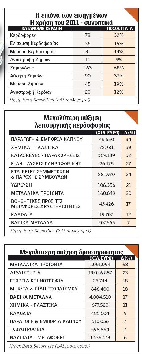 Ο υπεύθυνος του τμήματος αναλύσεων της «Beta Securi-ties» Μάνος Χατζηδάκης σημειώνει ότι «ήδη δύο τραπεζικοί όμιλοι βρίσκονται σε ειδικό καθεστώς λειτουργίας, ο κλάδος των κατασκευών και της πληροφορικής (εισηγμένες και μη) ακολουθεί μια επιταχυνόμενη πορεία αριθμητικής και λειτουργικής συρρίκνωσης, ενώ το λιανικό εμπόριο βρίσκεται σε αναζήτηση νέων ισορροπιών, όπως και ο χώρος των μέσων ενημέρωσης». Σε επίπεδο εταιρειών, για τις Μέτκα, Frigoglass, S&B, ΟΛΘ, Ελβάλ, ΕΥΔΑΠ, ΕΥΑΘ, Μotor Oil, Jumbo και Καρέλιας, το 2011 ήταν μια δυνατή χρονιά, γεγονός το οποίο τους δίνει κάποιο προβάδισμα σε μια πιθανή σταθεροποίηση της κατάστασης της εγχώριας οικονομίας.