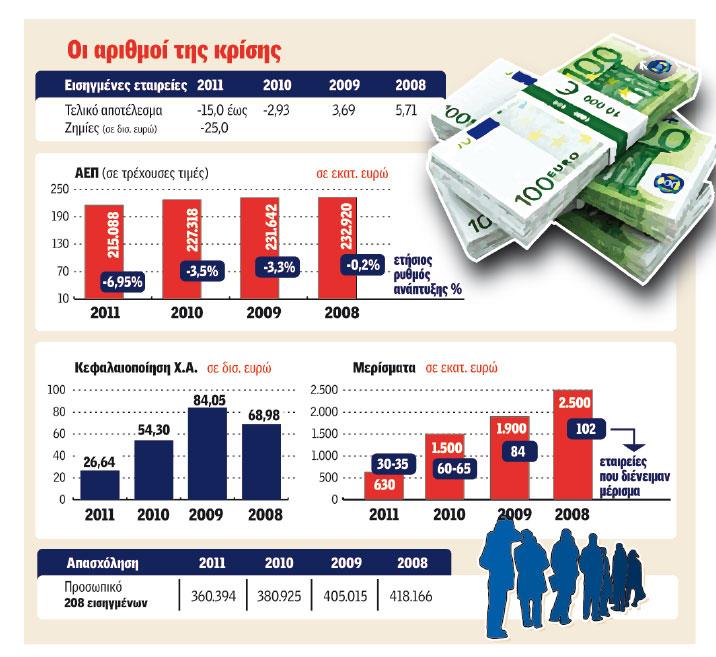 Από το ξέσπασμα της κρίσης μέχρι σήμερα, η συνολική κεφαλαιοποίηση της εγχώριας κεφαλαιαγοράς έχει υποχωρήσει πάνω από 80 δισ. ευρώ (στα επίπεδα των 28-29 δισ.), με το Γενικό Δείκτη να έχει επιστρέψει (σε απόλυτα νούμερα) 20 χρόνια πίσω και τη συντριπτική πλειονότητα των μετοχών να βρίσκεται σε ιστορικά χαμηλά επίπεδα. Πέραν όμως των μικρομετόχων, οι οποίοι έχουν δει την αξία του χαρτοφυλακίου τους να... «εξαφανίζεται», τεράστιο είναι το «πλήγμα» και για τις εισηγμένες επιχειρήσεις. Αρκετές εξ αυτών έχουν πάψει να λειτουργούν, πολλές βρίσκονται μία ανάσα από το οριστικό λουκέτο ύστερα από συνεχόμενες ζημιογόνες χρήσεις, ενώ ακόμη και αυτές που εμφανίζουν αντοχές στην κρίση, παρουσιάζουν σημαντική πτώση των μεγεθών τους. Είναι χαρακτηριστικό ότι από τα κέρδη 5,71 δισ. ευρώ του 2008 (και τα κέρδη-ρεκόρ ύψους 11 δισ. περίπου του 2007), το 2009 υποχώρησαν στα 3,7 δισ. για να ακολουθήσουν δύο «μαύρες» χρονιές για τις εισηγμένες με περίπου 3 δισ. ευρώ ζημίες το 2010 και... διψήφιες ζημιές για τη χρονιά που πέρασε.
