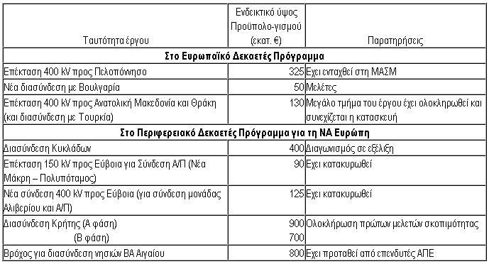 Στο δεκαετές πρόγραμμα ανάπτυξης του ENTSO-E (Ten Year Network Investment Plan TYNDP) έχουν περιληφθεί έργα διευρωπαϊκής σημασίας (European Significance) και έργα Εθνικής και Περιφερειακής σημασίας (Project of National and Regional Significance) βάσει κριτηρίων που έχουν θεσπιστεί από τον ENTSO-E. Τα έργα που εντάσσονται στις δύο κατηγορίες από πλευράς ΑΔΜΗΕ δίνονται στον παρακάτω πίνακα.