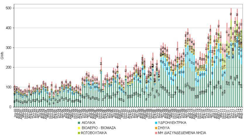 για τα αιολικά, 61.577,36 μεγαβατώρες για τα φωτοβολταϊκά, 83.472 μεγαβατώρες για