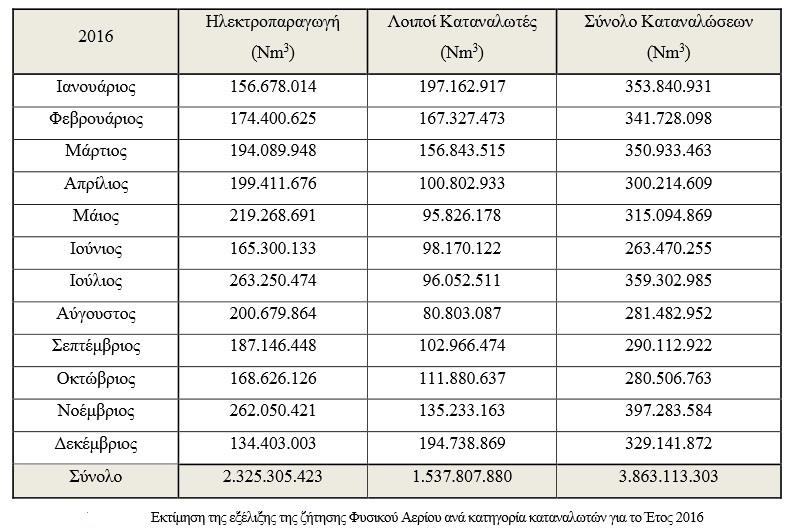 Η εκτιμώμενη ζήτηση αερίου τον κάθε ένα μήνα του 2016 ανά