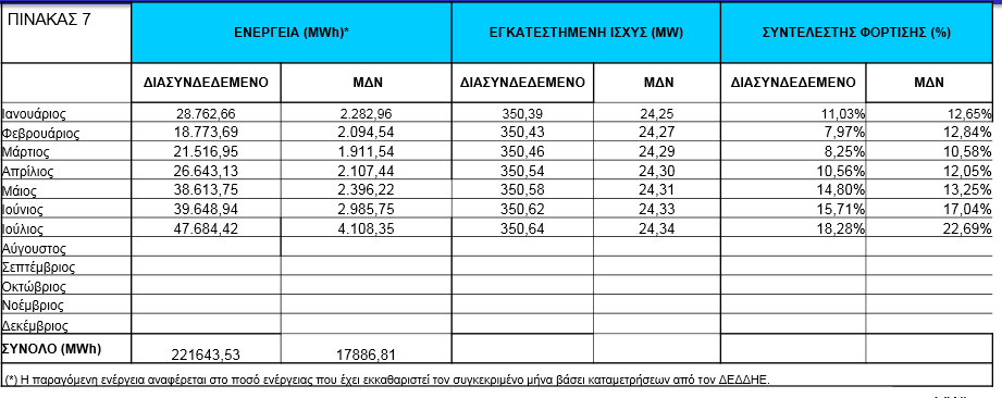 στα 350,64 MW τον Ιούλιο, αντί των 350,62 MW τον Ιούνιο, ενώ σε αυτά του ΜΔΝ η